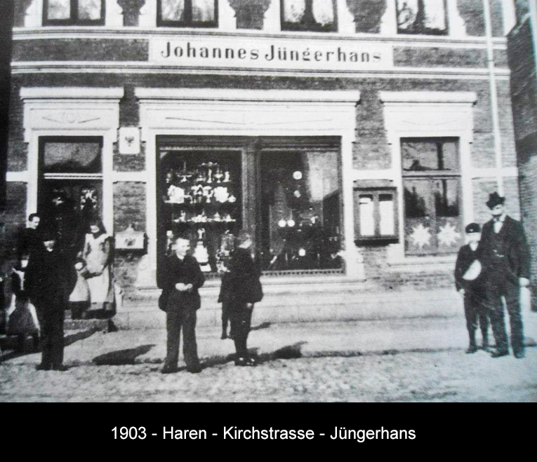 Die Bilder unten zeigen das Haus des Uhrmachers Jüngerhans (gegründet 1838) von ca. 1903 bis 2018, der später in der "Lange Strasse" (siehe auch dort) ein neues Geschäfts- und Wohnhaus errichtet hat. Das Haus in der Kirchstrasse wurde danach von verschiedenen Betrieben genutzt, u. a. vom ehemaligen Architekturbüro Steffens und Lübbering. 2018 hat dort eine Heilpraktikerschule ihren Sitz.