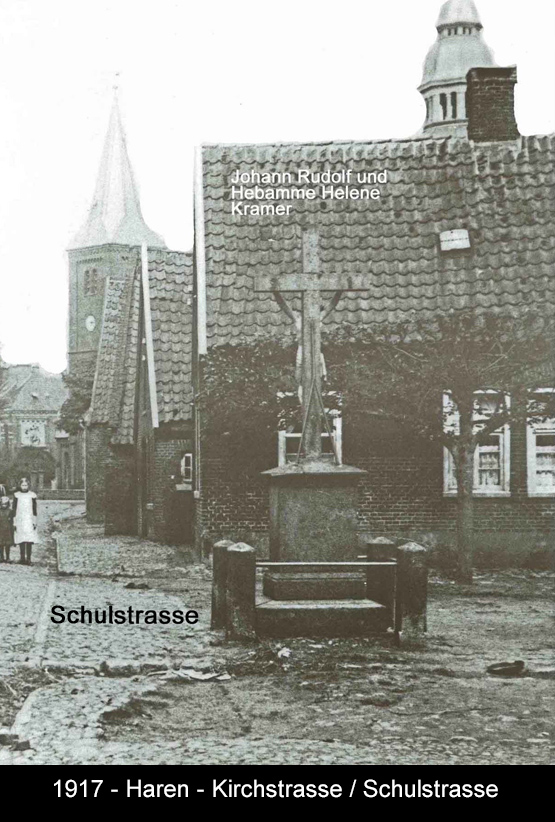 Das Wegekreuz an der Einmündung zur Schul-(Werft-) Strasse steht seit 1975 vor der Deichmauer am Schifffahrtsmuseum links neben dem Feuerwehrhaus. (siehe auch im Buch "Wegekreuze und Bildstöcke in Haren an der Ems") des Harener Heimatvereins.