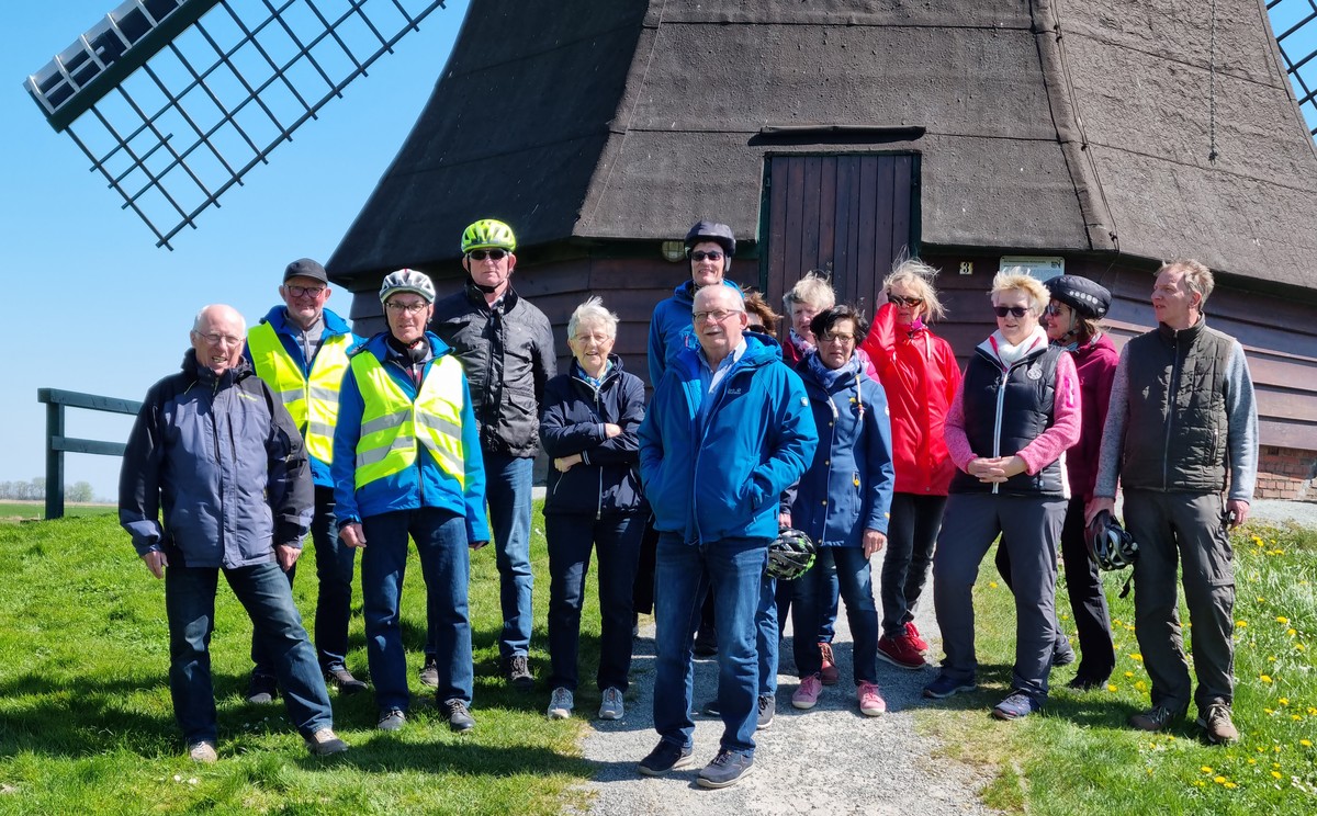Heribert gibt sich sehr verschwiegen auf Fragen nach unserem Ziel. Also bleibt es für uns weiterhin eine „Fahrt ins Blaue“. Wir biegen auf einen kleinen Schotterweg ab und kommen auf die Wasserschöpfmühle im Wynhamster Kolk. Dieser Kolk ist die tiefste Stelle Niedersachsens und liegt 2,5 m unter dem Meeresspiegel. Aufstellung zu einer Gruppenaufnahme und weiter geht es durch die schier endlose Gegend: So weit das Auge reicht nur Wiesen und flaches Grün kein Baum oder Gebüsch. Treue Begleiter sind die Schafe, die sich beim Grasen und Wiederkäuen nicht von uns stören lassen. Kaffeepause in Bunde. Einige stellen mit Schreck fest, dass – wegen des starken Windes – die Akkus fast leer sind und dringend aufgeladen werden müssen. Nur Lenchens Akku hat es nicht geschafft. So hat Peter sich geopfert und das Rad mit Lenchen getauscht. Weiter geht es über Weener, vorbei an den Törwieven am alten Hafen und am Kunstzentrum Coldam zurück nach Leer. Heribert ein Dankeschön für die gut vorbereitete Tour!